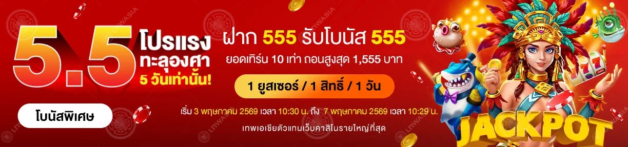 5.5 โปรแรงทะลุองศา โบนัสพิเศษมอบให้เฉพาะสมาชิกเทพเอเชีย เพียงฝาก 555 บาท รับโบนัส 555 บาท ถอนได้สูงสุด 1,555 บาท เทิร์นโอเวอร์ 10 เท่า สมาชิก 1 ยูสเซอร์ รับ 1 สิทธิ์ต่อ 1 วัน เฉพาะเกมสล็อตและยิงปลาจีคลับ